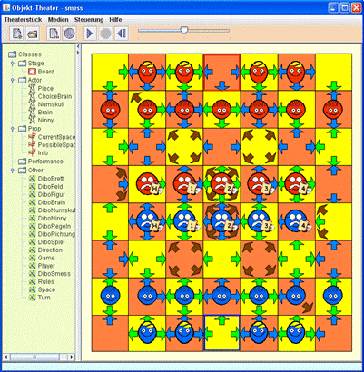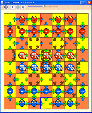 Weiterhin ist es über den Menüeintrag Exportieren möglich, Theaterstücke als Standalone-Programme zu generieren. Nach Auswahl eines entsprechenden Verzeichnisses und eines optionalen Startbildes werden in dem angegebenen Verzeichnis zwei Dateien performance.jar und performance.html erzeugt. (Hinweis: Die Namen der beiden Dateien dürfen nicht verändert werden!) Durch Doppelklick auf die Datei performance.jar bzw. Aufruf via java –jar performance.jar wird die Standalone-Anwendung gestartet. Die Datei performance.html lädt die Datei performance.jar als Applet. Der Objekt-Theater-Ordner enthält ein Unterverzeichnis exported_plays, in dem für die beigefügten Beispiel-Theaterstücke entsprechende Standalone-Programme erzeugt wurden. Abbildung 4.3 demonstriert dies für das Beispiel-Theaterstück smess. Über die Toolbar können Aufführungen des Theaterstücks gesteuert werden.