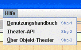 Über das Menü Hilfe haben Sie insbesondere die Möglichkeit, dieses Benutzerhandbuch zu öffnen. Weiterhin haben Sie Zugriff auf die detaillierte Referenz der Theater-API im javadoc-Format (siehe auch Abbildung 4.6).