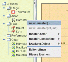 In den Popup-Menüs von Stage-, Actor- und Prop-Klassen erscheinen ferner auch für jeden public-Konstruktor der Klasse Items der Form „new <Konstruktor>“. Hierüber ist es möglich, interaktiv neue Objekte der entsprechenden Klassen zu erzeugen.