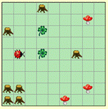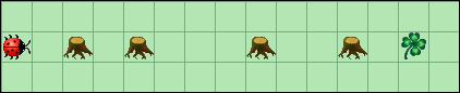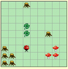 Kara, der Marienkäfer, lebt in einer rechteckigen Welt, die aus einzelnen Feldern besteht. Er kann sich nur von Feld zu Feld bewegen. Verlässt der Käfer die Welt an einer Seite, so betritt er sie auf der gegenüberliegenden Seite wieder. Auf den Feldern gibt es verschiedene Arten von Objekten (siehe auch Abbildung 3.1):