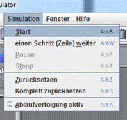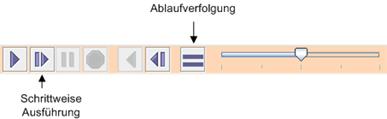 Die Funktionen des Debuggers sind eng mit den Funktionen zur Programmausführung verknüpft. Sie finden die Funktionen im Menü „Simulation“. Es bietet sich jedoch an, die entsprechenden Buttons der Toolbar zu verwenden. Neben dem „Start/Fortsetzen“-, dem „Pause“- und dem „Stopp“-Button gehören die zwei Buttons „Schrittweise Ausführung“ und „Ablaufverfolgung“ zu den Debugger-Funktionen (siehe auch Abbildung 6.18).