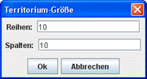 Durch Anklicken des „Größe ändern“-Buttons (6. Toolbar-Button von links) können Sie die Größe des Territoriums verändern. Es öffnet sich eine Dialogbox mit zwei Eingabefelder, in denen Sie die gewünschte Reihen- und Spaltenanzahl eingeben können. Nach Drücken des OK-Buttons schließt sich die Dialogbox und das Territorium erscheint in der angegebenen Größe.