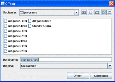 Möchten Sie ein einmal abgespeichertes Scratch-Kara-Programm wieder in den Editorbereich laden, können Sie dies über den Toolbar-Button „Laden“ oder das Menü-Item „Laden…“ des „Programm“-Menüs tun. Nach dem Anklicken des Items erscheint eine Dateiauswahl-Dialogbox, über die Sie die gewünschte Datei auswählen können.