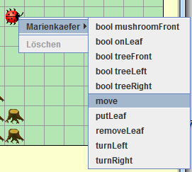 Alternativ zur Benutzung des Befehlsfensters ist es auch möglich, über ein Popup-Menü die Kara-Befehle interaktiv auszuführen. Sie können dieses Popup-Menü durch Drücken der rechten Maustaste oberhalb des Marienkäfers im Territorium aktivieren (siehe Abbildung 6.16).